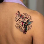 Spine tattoos are already dramatic by nature. Adding a dragonfly and star trail to that vertical canvas creates something genuinely breathtaking.
